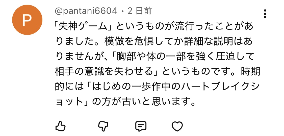 「失神ゲーム」というものが流行ったことがありました。胸部や体の一部を強く圧迫して、相手の意識を失わせるというものです。
