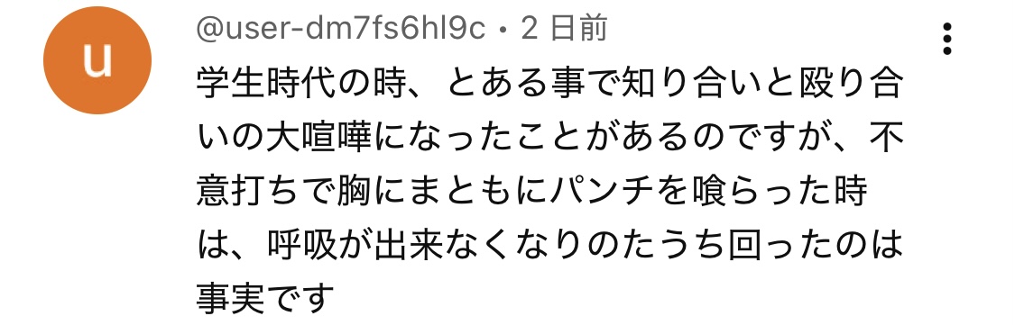 学生時代、不意打ちで胸にまともにパンチを喰らった時は、呼吸が出来なくなりのたうち回ったのは事実です